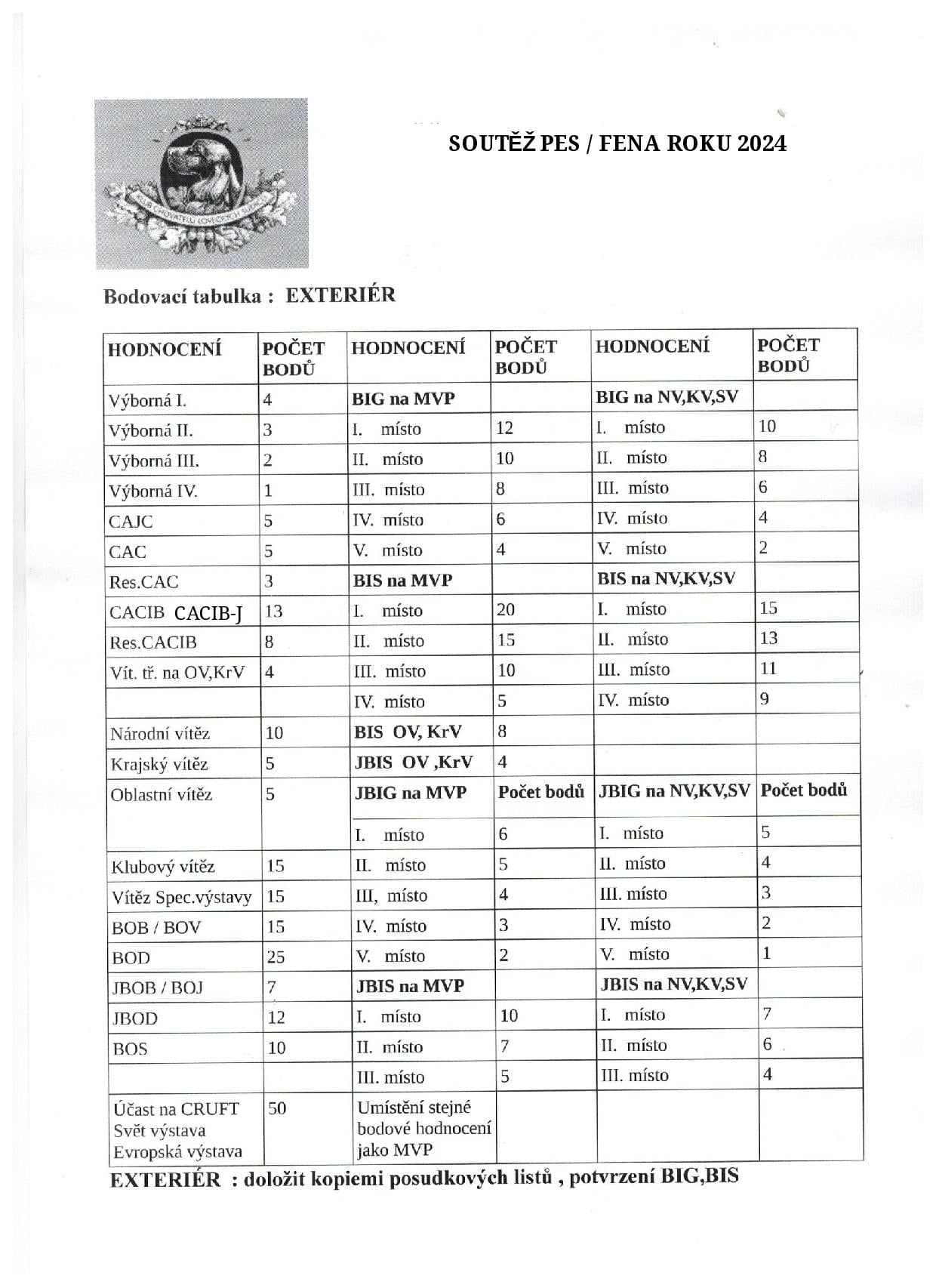 - V kategorii „exteriér“ zasílejte vyplněnou přihlášku s vypočtenými body společně s kopií posudkových listů nebo výpisem výstav z dog office. Např. při získání titulů BOD, BIS, BIG/BOG při závěrečných soutěžích.